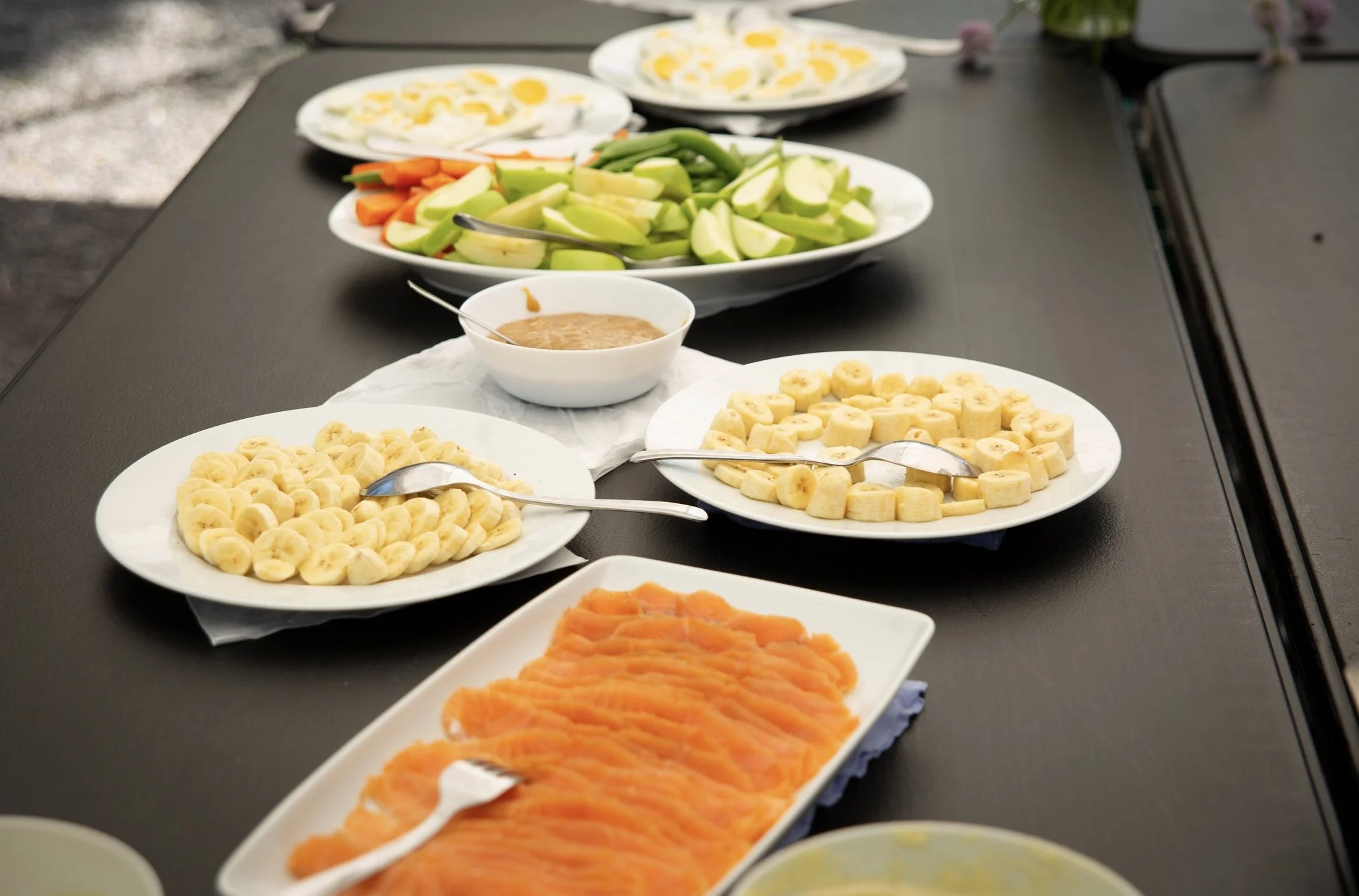 Frukt, grønt og hjemmerøyka laks.
