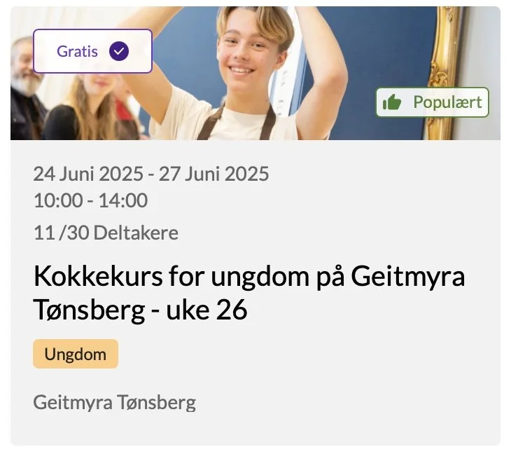 I ferien tilbyr Geitmyra Tønsberg 4-dagers gratis kokkekurs for deg som går på 7. - 10. trinn. Ingen grunn til bekymring hvis du er en fersking på kjøkkenet – alle er velkomne, uansett nivå! Og ikke glem å kle deg etter været, for vi skal utforske vår fantastiske hage!